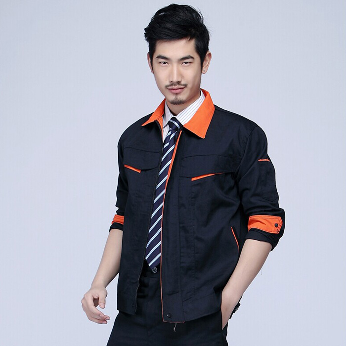 瑞發(fā)選擇的是JL-QD250款,此款以黑色為主色,胸前衣兜和筆袋采用橘色搭配,醒目,工業(yè)感強。前兜撞色拼接,走線細致,實用性強。左中腰間口袋均采用雙層設計,傾斜線條,穩(wěn)重大氣,以顯示設計師配合我們需要的理念,這是滿意。